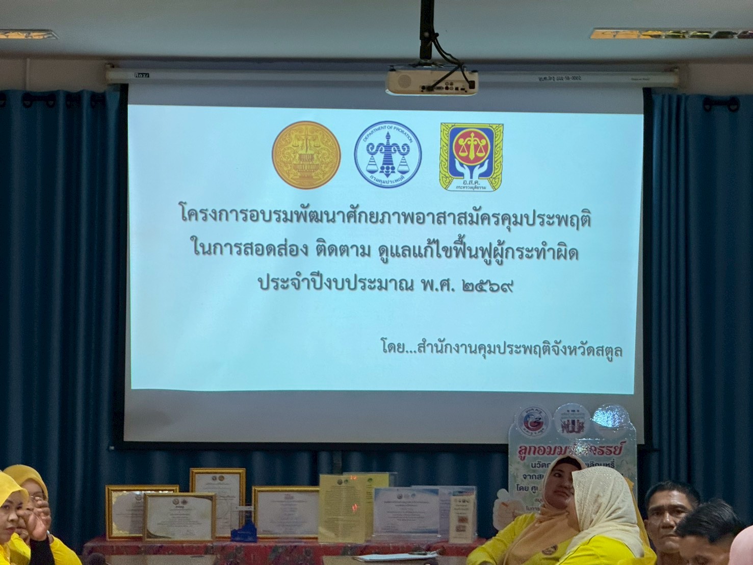 กรมคุมประพฤติ กระทรวงยุติธรรม โดยสำนักงานคุมประพฤติจังหวัดสตูล วันที่ 16 ตุลาคม 2568 นางปฐมา เอียดบัว ผู้อำนวยการสำนักงานคุมประพฤติจังหวัดสตูล พร้อมด้วยหัวหน้ากลุ่มคุมประพฤติพื้นที่ และหัวหน้ากลุ่มยุทธศาสตร์การคุมประพฤติ ร่วมเป็นวิทยากรในการจัดอบรมอาสาสมัครคุมประพฤติที่ได้รับการแต่งตั้งใหม่ อำเภอละงู จำนวน 59 คน ประจำปีงบประมาณ พ.ศ.2569 เพื่อพัฒนาศักยภาพและเพิ่มพูนองค์ความรู้ในการปฏิบัติงานอาสาสมัครคุมประพฤติในการบูรณาการป้องกัน ปราบปรามและแก้ไขปัญหายาเสพติด ตลอดจนฟื้นฟูผู้กระทำผิดในชุมชน อันเป็นการเสริมสร้างความพร้อมให้กับอาสาสมัครคุมประพฤติที่ได้รับการแต่งตั้งใหม่ให้สามารถปฏิบัติงานด้านต่าง ๆ ได้อย่างมีประสิทธิภาพและดำเนินงานตามภารกิจที่ได้รับมอบหมาย และได้กล่าวปฏิญาณตนเป็นอาสาสมัครคุมประพฤติ ณ ศูนย์ประสานงานอาสาสมัครคุมประพฤติอำเภอละงู จังหวัดสตูล