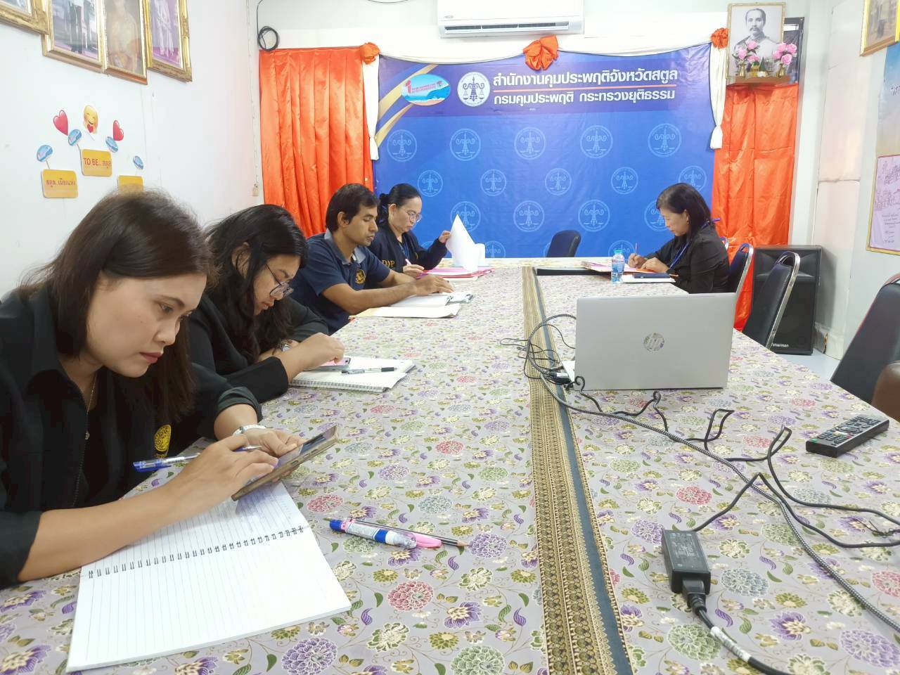 กรมคุมประพฤติ กระทรวงยุติธรรม โดยสำนักงานคุมประพฤติจังหวัดสตูล วันที่ 7 พฤศจิกายน 2568 นางปฐมา เอียดบัว ผู้อำนวยการสำนักงานคุมประพฤติจังหวัดสตูล มอบหมายให้หัวหน้ากลุ่ม/ฝ่าย และเจ้าหน้าที่ที่เกี่ยวข้อง เข้าร่วมประชุมซักซ้อมการดำเนินโครงการการให้คำปรึกษาเชิงจิตวิทยาแบบกลุ่มสำหรับผู้ถูกคุมความประพฤติ (ค่ายพลังใจ) ภายใต้แผนงานบูรณาการป้องกันและปราบปราม และแก้ไขปัญหายาเสพติด ประจำปีงบประมาณ พ.ศ.2569 ในรูปแบบทางไกลผ่านจอภาพ (Video Conference System) ณ ห้องประชุมสำนักงานคุมประพฤติจังหวัดสตูล ตำบลพิมาน อำเภอเมืองสตูล จังหวัดสตูล